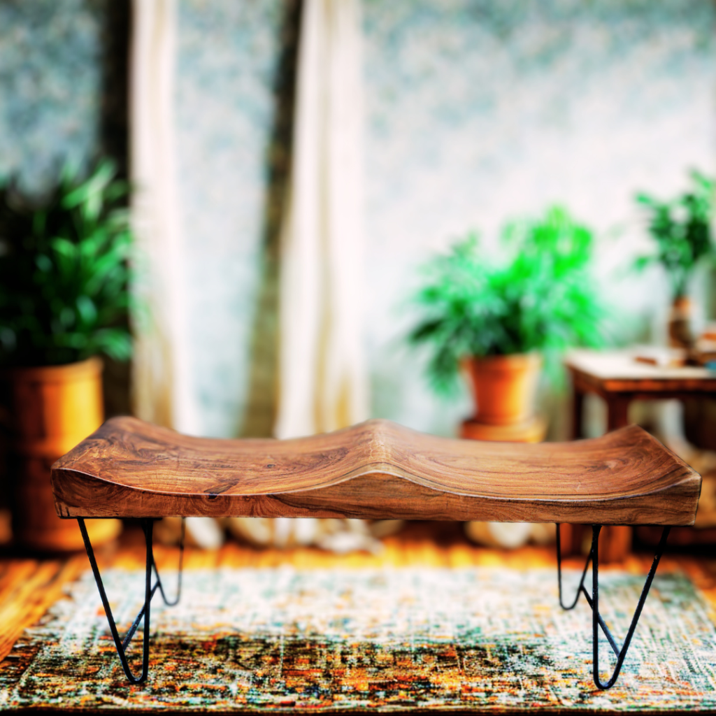 Handcrafted wooden centre table featuring natural wood grain patterns and a smooth finish that adds warmth and elegance to any living space